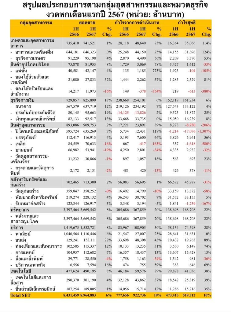 “ภาพรวมผลการดำเนินงานงวด 6 เดือนปี 2567 ของ บจ.ใน mai ปรับตัวดีขึ้น บจ. มีการควบคุมทั้งต้นทุนและค่าใช้จ่ายในการขายและบริหารมาตั้งแต่ไตรมาสแรกในปีนี้ ทำให้ความสามารถในการทำกำไรดีขึ้น และหากพิจารณารายกลุ่มอุตสาหกรรม พบว่ายอดขายเติบโตในเกือบทุกกลุ่มอุตสาหกรรม ยกเว้นกลุ่มทรัพยากรที่มียอดขายลดลงเล็กน้อย แต่หากพิจารณากำไรจากการดำเนินงานและกำไรสุทธิ เกือบทุกกลุ่มอุตสาหกรรมมีอัตราการเติบโตเพิ่มขึ้น มีเพียงกลุ่มสินค้าอุปโภคบริโภค และกลุ่มเทคโนโลยีที่มีกำไรลดลง” นายประพันธ์ กล่าว