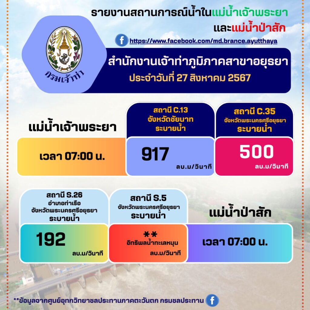 สำหรับสถานการณ์น้ำในวันนี้ (27 สิงหาคม 2567) เขื่อนเจ้าพระยา เริ่มทยอยปรับเพิ่มการระบายน้ำแบบขั้นบันได ให้สอดคล้องกับสถานการณ์ เพื่อเตรียมรองรับปริมาณน้ำทางตอนบนและฝนที่ตกในระยะนี้ สถานี C13 เขื่อนเจ้าพระยา จังหวัดชัยนาท ปริมาณน้ำไหลผ่าน 917 ลบ.ม/วินาที ระดับน้ำท้ายเขื่อน : ต่ำกว่าตลิ่ง 5.73 เมตร ส่งผลให้ระดับน้ำบริเวณพื้นที่ลุ่มต่ำนอกคันกั้นน้ำบริเวณคลองโผงเผง จังหวัดอ่างทอง คลองบางบาล จังหวัดพระนครศรีอยุธยาและตำบลหัวเวียง อำเภอเสนา ตำบลลาดชิด ตำบลท่าดินแดง อำเภอผักไห่ จังหวัดพระนครศรีอยุธยา (แม่น้ำน้อย) เพิ่มสูงขึ้นจากปัจจุบันอีกประมาณ 50 เซนติเมตร ถึง 1.50 เมตร ขอให้ประชาชนที่อาศัยอยู่ริมแม่น้ำเฝ้าระวังและติดตามสถานการณ์น้ำอย่างใกล้ชิด กรมเจ้าท่า ขอรายงานสถานการณ์การบูรณาการร่วมกับหน่วยงานต่าง ๆ ในพื้นที่ ในการช่วยเหลือพี่น้องประชาชน จากศูนย์ช่วยเหลือผู้ประสบอุทกภัยพื้นที่ภาคเหนือ ประจำวันที่ 26 สิงหาคม 2567 ดังนี้