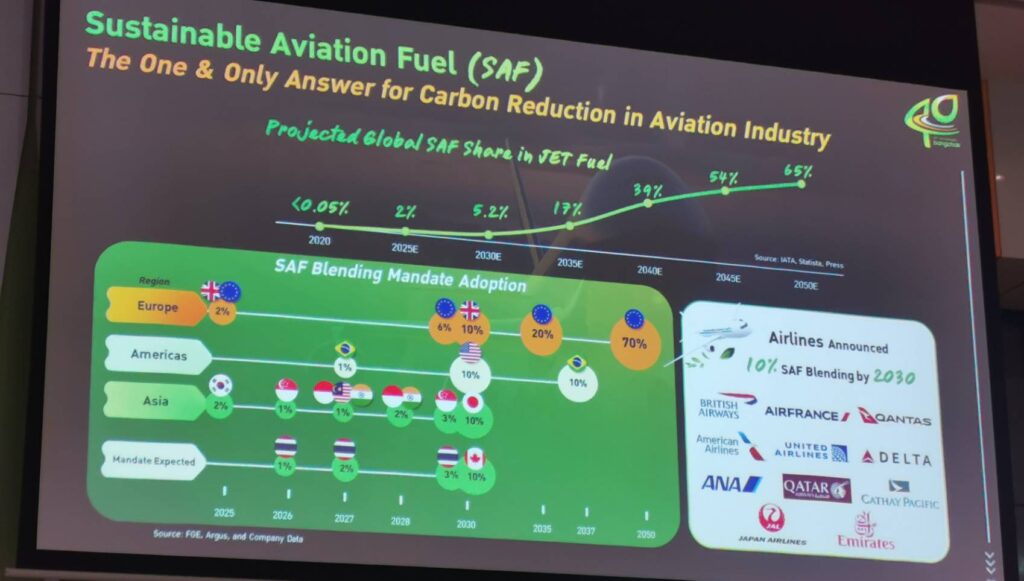 นอกจากนี้ ในปี 68 จะเป็นปีแห่งการบุกเบิกความเป็นผู้นำในการผลิตน้ำมันเชื้อเพลิงอากาศยานยั่งยืน (SAF) ด้วยกำลังการผลิต 7,000 บาร์เรลต่อวัน BCP มีความพร้อมจัดหาวัตถุดิบจากเครือข่ายพันธมิตรและการรับซื้อน้ำมันพืชใช้แล้วผ่านโครงการทอดไม่ทิ้งทั่วประเทศ