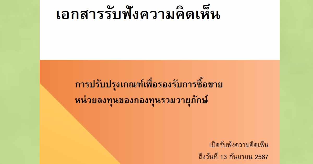 ตลาดหลักทรัพย์แห่งประเทศไทย แจ้งว่า ตามที่รัฐบาลมีนโยบายให้มีการระดมทุนของกองทุนรวมวายุภักษ์หนึ่ง (VAYU1) เพื่อเป็นกลไกเสริมสร้างการออมและการลงทุนให้กับประชาชน รวมทั้งสนับสนุนการพัฒนาตลาดเงินและตลาดทุนของประเทศ โดยคาดว่าจะเสนอขายหน่วยลงทุนประเภท ก. แก่ผู้ลงทุนทั่วไป และนำเข้าจดทะเบียนกับตลาดหลักทรัพย์แห่งประเทศไทยต่อไป ดังนั้น เพื่อปรับปรุงหลักเกณฑ์ที่เกี่ยวข้องให้รองรับการจดทะเบียนและการซื้อขายหน่วยลงทุนของกองทุนรวม (Mutual Funds) ให้มีความเหมาะสมยิ่งขึ้น และเป็นประโยชน์แก่ผู้ลงทุน ตลาดหลักทรัพย์ฯ จึงเปิดรับฟังความคิดเห็นจากผู้ที่เกี่ยวข้อง ดังนี้