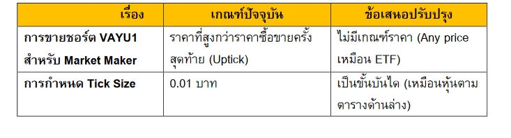2) ปรับปรุงเกณฑ์ราคาขายชอร์ตให้แก่ผู้ที่ประสงค์จะทำหน้าที่ดูแลสภาพคล่อง (Market Maker) ของ VAYU1 และช่วงราคา (Tick Size) ในการซื้อขาย VAYU1 เพื่อสนับสนุนการทำหน้าที่ของ Market Maker ในการช่วยส่งเสริมสภาพคล่องเพื่อประโยชน์แก่ผู้ลงทุน