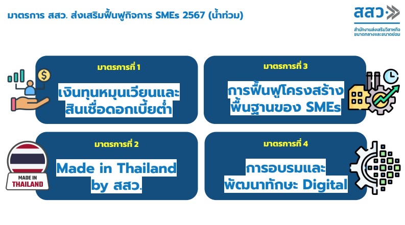 4.มาตรการ การอบรมและพัฒนาทักษะ ยกระดับองค์กร และ SMEs ให้ก้าวไปสู่ SMEs Next Level ใช้งบประมาณ 200 ล้านบาท สําหรับการจัดอบรมและพัฒนาทักษะให้กับผู้ประกอบการ SMEs เพื่อเพิ่มความสามารถในการรับมือกับภาวะวิกฤติ และการปรับตัวให้เข้ากับสภาพตลาดที่เปลี่ยนแปลงไปหลังน้ำท่วม เช่น การอบรมด้านการบริหารความเสี่ยง การวางแผนธุรกิจและการจัดการ Digital Transformation . – สำนักข่าวไทย