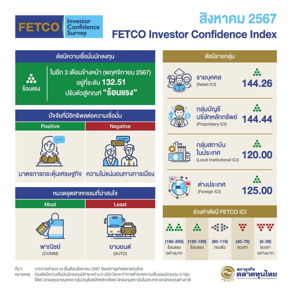 นายกอบศักดิ์ ภูตระกูล ประธานกรรมการสภาธุรกิจตลาดทุนไทย (FETCO) เปิดเผยดัชนีความเชื่อมั่นนักลงทุน ผลสำรวจในเดือนสิงหาคม 2567 พบว่า “ดัชนีความเชื่อมั่นนักลงทุนในอีก 3 เดือนข้างหน้าอยู่ที่ระดับ 132.51 ปรับเพิ่มขึ้นกลับมาอยู่ในเกณฑ์ “ร้อนแรง” จากมาตรการกระตุ้นเศรษฐกิจของภาครัฐ ที่หนุนความเชื่อมั่นมากที่สุด รองลงมาคือการฟื้นตัวของเศรษฐกิจในประเทศ และสัญญาณบวกจากความชัดเจนของการเมืองในประเทศ ขณะที่ปัจจัยที่ฉุดความเชื่อมั่นนักลงทุนมากที่สุด ได้แก่ ความไม่แน่นอนของสถานการณ์การเมืองในประเทศ รองลงมาคือการถดถอยของเศรษฐกิจในประเทศ และสภาวะเงินเฟ้อ หมวดธุรกิจที่น่าสนใจมากที่สุด คือ หมวดพาณิชย์ และหมวดธุรกิจที่ไม่น่าสนใจมากที่สุด คือ หมวดยานยนต์