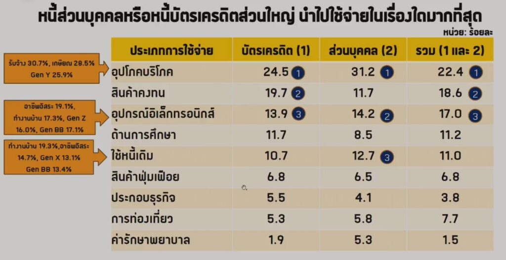 สำหรับประเภทหนี้ อันดับ 1 คือ หนี้บัตรเครดิต รองลงมา หนี้ยานพาหนะ, หนี้ส่วนบุคคล, หนี้ที่อยู่อาศัย, หนี้ประกอบธุรกิจ และหนี้การศึกษา