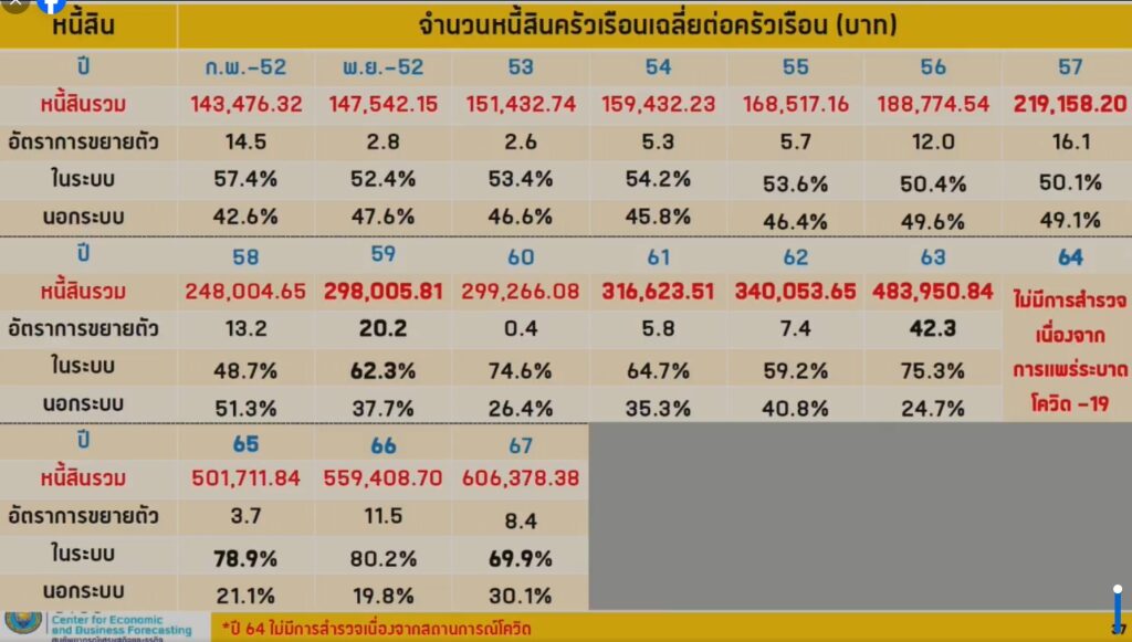 ทั้งนี้ ศูนย์พยากรณ์เศรษฐกิจและธุรกิจ มหาวิทยาลัยหอการค้าไทย เปิดเผยผลสำรวจสถานภาพหนี้ครัวเรือนไทย ปี 67 พบว่า ครัวเรือนไทยมีภาระหนี้สินเฉลี่ย 606,378 บาท/ครัวเรือน เพิ่มขึ้นจากปีก่อน 8.4% และเพิ่มสูงสุดตั้งแต่มีการสำรวจในรอบ 15 ปี นับตั้งแต่ปี 52 โดยในจำนวนนี้ เป็นหนี้ในระบบ 69.9% และอีก 30.1% เป็นหนี้นอกระบบ