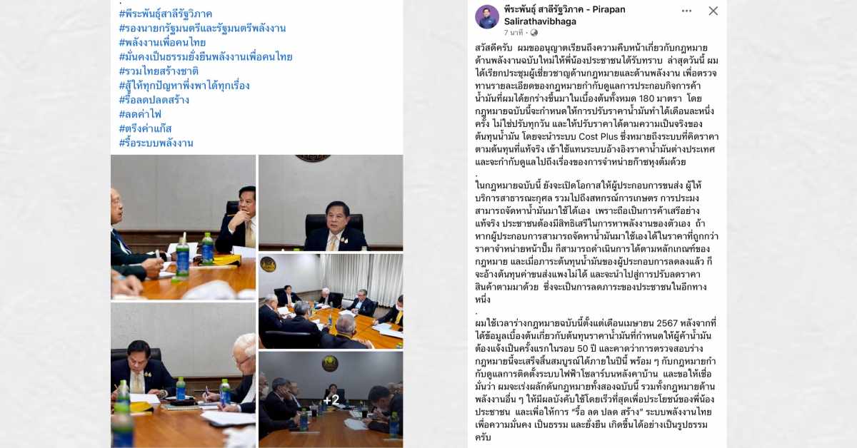 กรุงเทพฯ 10 ก.ย. – นายพีระพันธุ์ สาลีรัฐวิภาค รองนายกฯ และรมว.พลังงาน โพสต์เฟสบุ๊กส่วนตัว เผยความคืบหน้ากฎหมายด้านพลังงานฉบับใหม่ ให้ผู้ค้าปรับราคาได้เดือนละครั้ง กันขึ้น-ลงตามใจชอบ โดยระบุว่า สวัสดีครับ ผมขออนุญาตเรียนถึงความคืบหน้าเกี่ยวกับกฎหมายด้านพลังงานฉบับใหม่ให้พี่น้องประชาชนได้รับทราบ ล่าสุดวันนี้ ผมได้เรียกประชุมผู้เชี่ยวชาญด้านกฎหมายและด้านพลังงาน เพื่อตรวจทานรายละเอียดของกฎหมายกำกับดูแลการประกอบกิจการค้าน้ำมันที่ผมได้ยกร่างขึ้นมาในเบื้องต้นทั้งหมด 180 มาตรา โดยกฎหมายฉบับนี้จะกำหนดให้การปรับราคาน้ำมันทำได้เดือนละหนึ่งครั้ง ไม่ใช่ปรับทุกวัน และให้ปรับราคาได้ตามความเป็นจริงของต้นทุนน้ำมัน โดยจะนำระบบ Cost Plus ซึ่งหมายถึงระบบที่คิดราคาตามต้นทุนที่แท้จริง เข้าใช้แทนระบบอ้างอิงราคาน้ำมันต่างประเทศ และจะกำกับดูแลไปถึงเรื่องของการจำหน่ายก๊าซหุงต้มด้วย