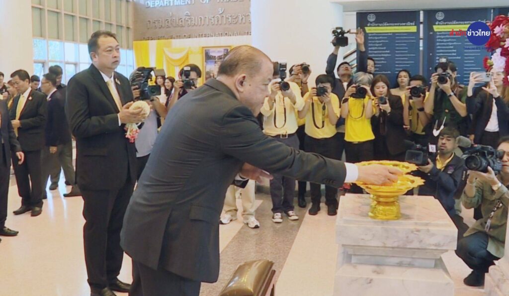 นายพิชัย นริพทะพันธุ์ รัฐมนตรีว่าการกระทรวงพาณิชย์ เข้ากระทรวงพาณิชย์เป็นวันแรก สักการะสิ่งศักดิ์สิทธิ์ประจำกระทรวงฯ โดยมีนายนภินทร ศรีสรรพางค์ รัฐมนตรีช่วยว่าการกระทรวงพาณิชย์ นายสุชาติ ชมกลิ่น รัฐมนตรีช่วยว่าการกระทรวงพาณิชย์ พร้อมด้วยผู้บริหารระดับสูงกระทรวงพาณิชย์ ให้การต้อนรับ