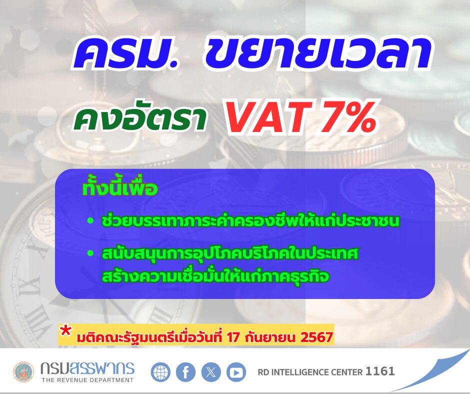 กรุงเทพฯ 17 ก.ย. – สรรพากร เผย ครม. ขยายเวลาคงภาษีมูลค่าเพิ่ม (VAT) 7% อีก 1 ปี เพื่อรักษาระดับการขยายตัวของการอุปโภคบริโภค