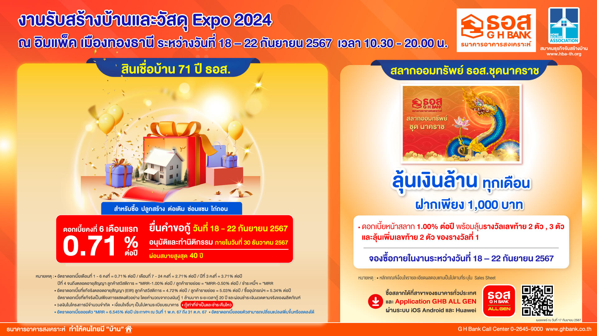 กรุงเทพฯ 17 ก.ย.- ธอส. ออกสินเชื่อบ้านอัตราดอกเบี้ยต่ำ 6 เดือนแรกเพียง 0.71% ต่อปี ร่วมงาน “รับสร้างบ้านและวัสดุ Expo 2024”