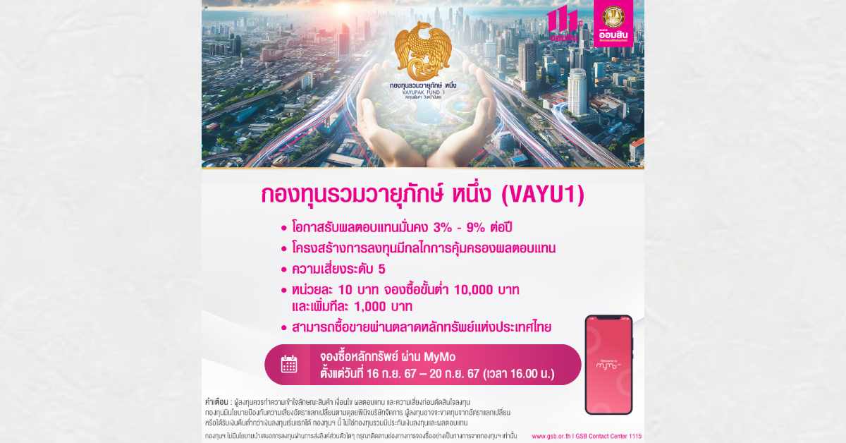 นายวิทัย รัตนากร ผู้อำนวยการธนาคารออมสิน เปิดเผยว่า ตามที่กระทรวงการคลัง ได้เปิดขายหน่วยลงทุนกองทุนรวมวายุภักษ์ หนึ่ง (VAYU1) หน่วยลงทุนประเภท ก. แก่ประชาชนทั่วไป เพื่อเป็นทางเลือกการลงทุน พร้อมสนับสนุนการพัฒนาตลาดทุนของประเทศ โดยโครงสร้างการลงทุนของกองทุน VAYU1 มีกลไกคุ้มครองผลตอบแทนที่มั่นคง ในอัตราไม่ต่ำกว่า 3% ต่อปี และสูงสุดไม่เกิน 9% ต่อปี