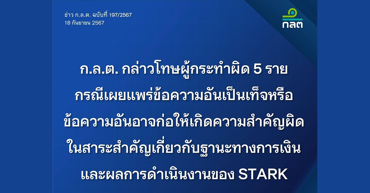 กรุงเทพฯ 18 ก.ย.- ก.ล.ต. กล่าวโทษผู้กระทำผิด 5 ราย กรณีเผยแพร่ข้อความอันเป็นเท็จหรือข้อความอันอาจก่อให้เกิดความสำคัญผิดในสาระสำคัญเกี่ยวกับฐานะทางการเงินและผลการดำเนินงานของ STARK