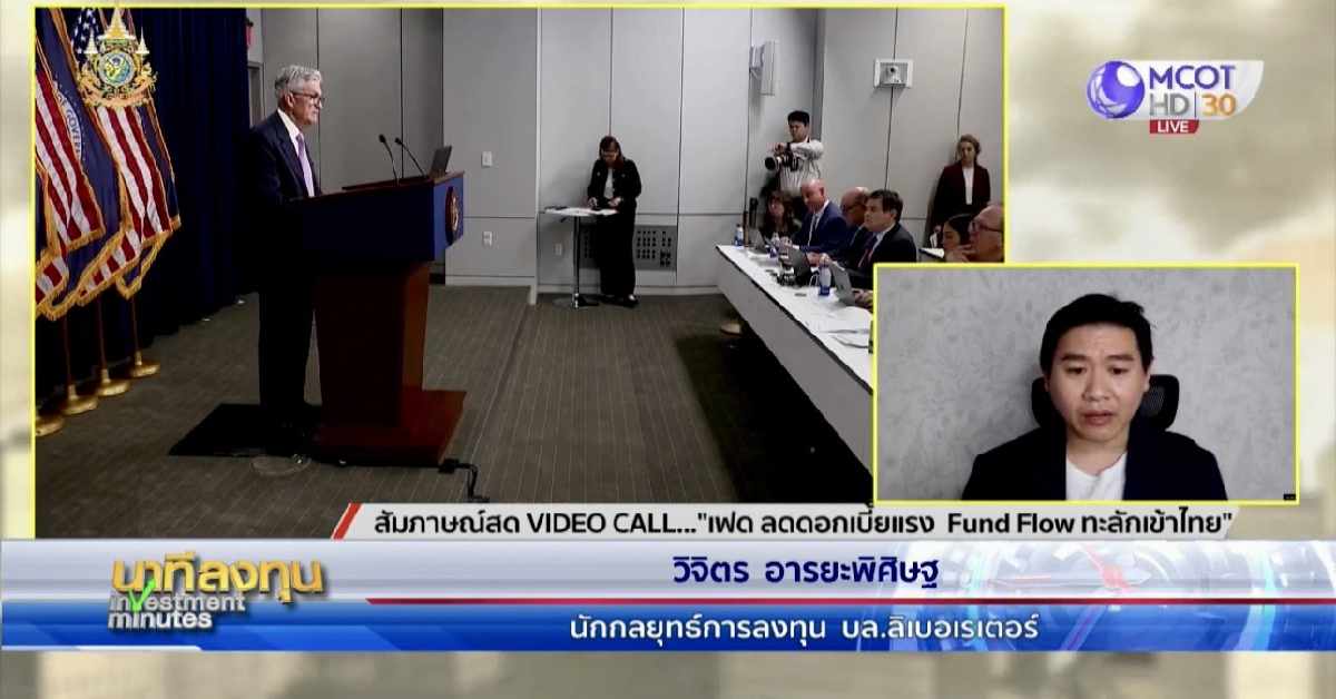 นายวิจิตร อารยะพิศิษฐ นักกลยุทธ์การลงทุน บล.ลิเบอเรเตอร์ ให้สัมภาษณ์ในรายการนาทีลงทุน สำนักข่าวไทย ช่อง 9 MCOT HD ถึงกรณีที่ธนาคารกลางสหรัฐฯ (เฟด) ลดอัตราดอกเบี้ย 0.50% สู่ระดับ 4.75-5.00% เป็นการปรับลดอัตราดอกเบี้ยครั้งแรกในรอบกว่า 4 ปี ว่า มากกว่าที่นักวิเคราะห์ประเมินไว้ที่ 0.25% ส่วนการคาดการณ์อัตราดอกเบี้ยนโยบาย หรือ Dot Plot นั้น เจ้าหน้าที่เฟดส่งสัญญาณปรับลดอัตราดอกเบี้ยอีก 0.50% ภายในสิ้นปีนี้ สวนทางกับที่นักวิเคราะห์ประเมินว่าจะปรับเพิ่มขึ้น 0.50% ภายในปีนี้ ประกอบกับนายเจอโรม พาวเวล ประธานเฟด ยังออกมาระบุว่าเศรษฐกิจสหรัฐฯ มีการขยายตัวที่แข็งแกร่ง และเงินเฟ้อกำลังชะลอตัวกำลังขยับไปที่ระดับ 2% ยังไม่มีสัญญาณเศรษฐกิจของสหรัฐยังไม่เข้าสู่ภาวะถดถอย ส่งผลตลาดหุ้นสหรัฐผันผวน โดยพุ่งขึ้นแตะระดับสูงสุดเป็นประวัติการณ์ในระหว่างวัน ก่อนชะลอตัวลง และปิดตลาดติดลบ