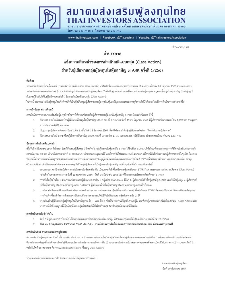 สมาคมส่งเสริมผู้ลงทุนไทยแจ้งว่า จากความเสียหายที่เกิดขึ้น กรณี บริษัท สตาร์ค คอร์ปอเรชั่น จำกัด (มหาชน) – STARK โดยมีการแถลงข่าวร่วมกันของ 11 องค์กร เมื่อวันที่ 26 มิถุนายน 2566 สำนักงานกำกับ หลักทรัพย์และตลาดหลักทรัพย์ (ก.ล.ต.) สนับสนุนให้สมาคมส่งเสริมผู้ลงทุนไทย (TIA) เป็นศูนย์กลางในการให้ความช่วยเหลือผู้ลงทุนรายบุคคลที่ลงทุนในหุ้นสามัญ (กรณีหุ้นกู้ มี ตัวแทนผู้ถือหุ้นกู้เป็นผู้รับผิดชอบอยู่แล้ว) ในการดำเนินคดีแบบกลุ่ม (Class Action)