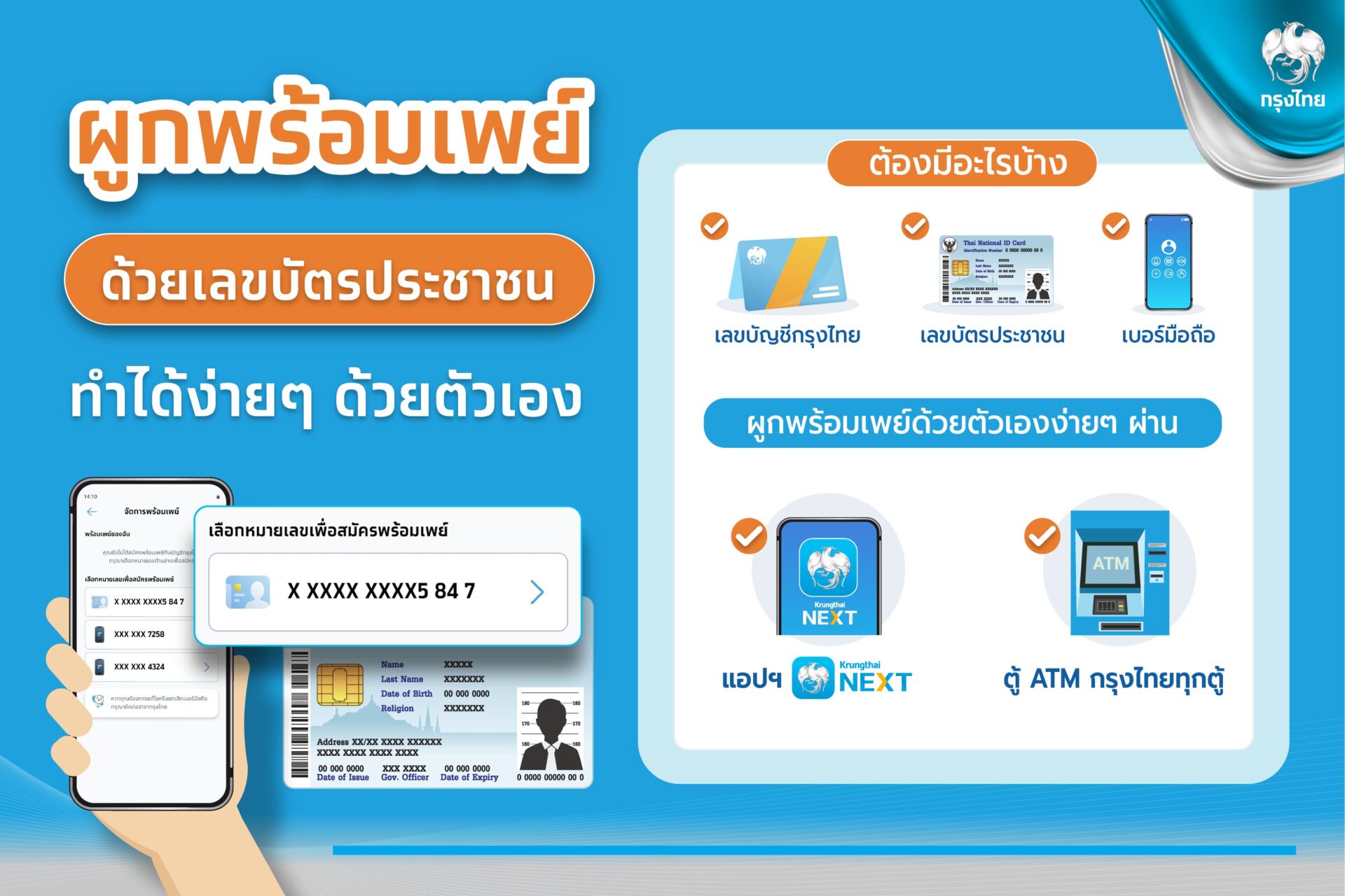 ธนาคารกรุงไทย พร้อมอำนวยความสะดวกประชาชน ในการผูกพร้อมเพย์ด้วยเลขบัตรประชาชน เพื่อเตรียมรับเงินในโครงการดิจิทัลวอลเล็ต 10,000 บาท ผ่านทุกช่องทางของธนาคาร อย่างไรก็ตาม เพื่อความสะดวก และรวดเร็ว ลูกค้าและประชาชนสามารถสมัครบริการผูกพร้อมเพย์ด้วยตัวเอง ผ่านแอปพลิเคชัน Krungthai NEXT และตู้ ATM กรุงไทยทั่วประเทศ ง่ายๆ ดังนี้