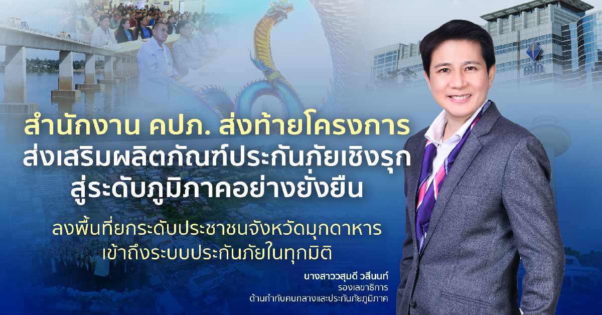 รองเลขาธิการ ด้านกำกับคนกลางฯ เปิดเผยว่า สำนักงาน คปภ. มีนโยบายในการส่งเสริมความรู้สร้างความเข้าใจให้ประชาชนทั่วประเทศ ตระหนักและเห็นความสำคัญของการทำประกันภัยที่เป็นเครื่องมือในการบริหารความเสี่ยงให้กับชีวิตและทรัพย์สินของประชาชน ดังนั้น จึงได้ดำเนินโครงการส่งเสริมผลิตภัณฑ์ประกันภัยเชิงรุกสู่ระดับภูมิภาคอย่างยั่งยืน ประจำปี 2567 เพื่อให้ประชาชนทุกกลุ่มเป้าหมายสามารถเข้าถึงระบบประกันภัยในบริบทของพื้นที่ได้อย่างทั่วถึง และครั้งนี้นับเป็นครั้งที่ 9 โดยได้เลือกจังหวัดมุกดาหารเป็นจังหวัดสุดท้ายของการดำเนินโครงการฯ