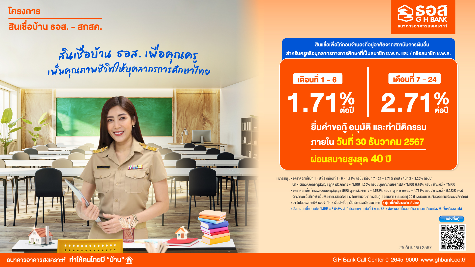 ธนาคารอาคารสงเคราะห์ (ธอส.) ร่วมกับสำนักงานคณะกรรมการส่งเสริมสวัสดิการและสวัสดิภาพครูและบุคลากรทางการศึกษา (สกสค.) ลงนามบันทึกความร่วมมือ (MOU) ยกระดับคุณภาพชีวิตครูและบุคลากรทางการศึกษา ภายใต้โครงการสินเชื่อบ้าน ธอส.-สกสค. โดยมี พล.ต.อ.เพิ่มพูน ชิดชอบ รัฐมนตรีว่าการกระทรวงศึกษาธิการ เป็นประธานในพิธีลงนาม ซึ่งการลงนาม MOU ในครั้งนี้ มีกรอบวงเงิน 1,000 ล้านบาท จัดทำสินเชื่ออัตราดอกเบี้ยพิเศษ 6 เดือนแรกเพียง 1.71% ต่อปี เฉลี่ย 3 ปีแรก 2.71% ต่อปี สำหรับครู หรือบุคลากรทางการศึกษาที่เป็นสมาชิกการฌาปนกิจสงเคราะห์ช่วยเหลือเพื่อนครูและบุคลากรทางการศึกษา (ช.พ.ค.) และ/หรือ สมาชิกการฌาปนกิจสงเคราะห์ช่วยเหลือเพื่อนครูและบุคลากรทางการศึกษาในกรณีที่คู่สมรสถึงแก่กรรม (ช.พ.ส.) ที่ต้องการไถ่ถอนจำนองจากสถาบันการเงินอื่น มายัง ธอส. กรณีกู้ 1 ล้านบาท ผ่อนชำระเงินงวดเริ่มต้นเพียง 2,900 บาทต่อเดือน เท่านั้น พิเศษ! ฟรีค่าธรรมเนียมจดทะเบียนการจำนอง 1% ของวงเงินจำนอง ผู้ที่สนใจสามารถยื่นขอสินเชื่อได้ตั้งแต่วันที่ 25 กันยายน 2567 ถึงวันที่ 30 ธันวาคม 2567 ณ สาขาธนาคารทั่วประเทศ พร้อมกันนี้ยังมีเงินฝากประจำสะสมทรัพย์ สนับสนุนภาคการออม หากฝากครบตามเงื่อนไขได้รับอัตราดอกเบี้ยเท่ากับเงินฝากประจำ 12 เดือน ตามที่ธนาคารประกาศไว้ ณ วันที่เปิดบัญชี บวกเพิ่มอัตราดอกเบี้ย 1.00% ต่อปี คิดเป็นอัตราดอกเบี้ย 2.70% ต่อปี (เงินฝากประจำ 12 เดือน ณ วันที่ 25 กันยายน 2567 เท่ากับ 1.70% ต่อปี)
