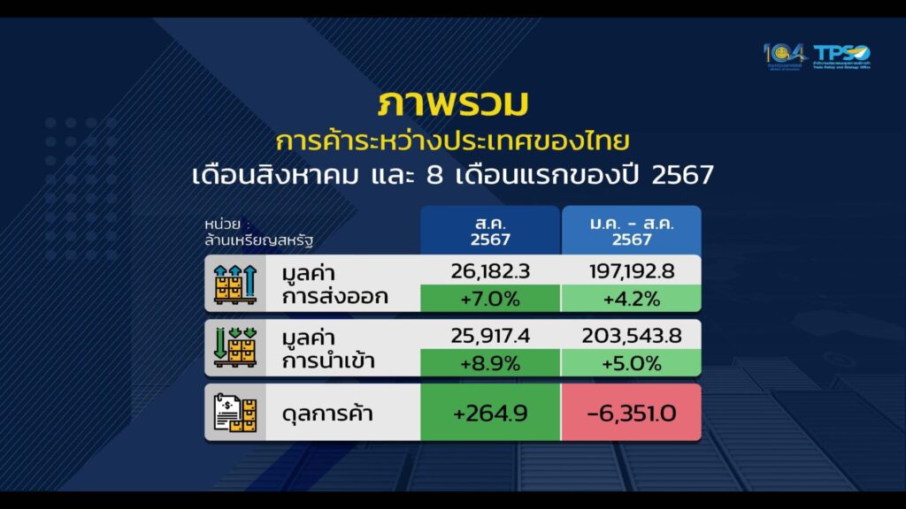 นายพูนพงษ์ นัยนาภากรณ์ ผู้อำนวยการสำนักงานนโยบายและยุทธศาสตร์การค้า (สนค.) แถลงว่ายอดส่งออก ส.ค.ที่เพิ่มขึ้น 7 % ดังกล่าวส่งผลให้ช่วง 8 เดือนแรกของปีนี้ (ม.ค.-ส.ค.67) การส่งออกของไทย มีมูลค่ารวม 197,192 ล้านดอลลาร์ เพิ่มขึ้น 4.2% ส่วนการนำเข้า มีมูลค่า 203,543 ล้านดอลลาร์ เพิ่มขึ้น 5% ส่งผลให้ 8 เดือนแรกปีนี้ ไทยยังคงขาดดุลการค้า 6,351 ล้านดอลลาร์