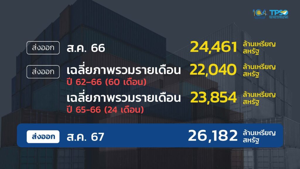 กรุงเทพฯ 25 ก.ย. – การส่งออก ส.ค.มีมูลค่า 26,182 ล้านดอลลาร์สหรัฐ เพิ่มขึ้น 7% จากที่ตลาดคาดโต 6% ขณะที่การนำเข้า มีมูลค่า 25,917 ล้านดอลลาร์ฯ เพิ่มขึ้น 8.9% ส่งผลให้ในเดือน ส.ค.นี้ ไทยเกินดุลการค้า 264.9 ล้านดอลลาร์ฯ