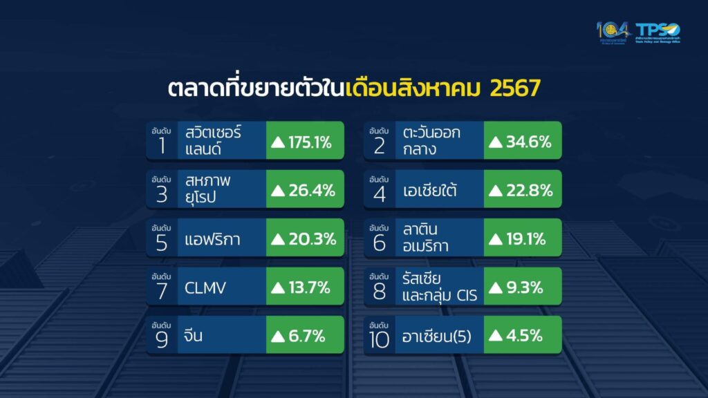 สำหรับการส่งออกเดือนสิงหาคม 67 ที่ขยาย 7% หากหักสินค้าเกี่ยวเนื่องกับน้ำมัน ทองคำ และยุทธปัจจัย การส่งออกขยายตัวที่ 6.6% การส่งออกขยายตัวต่อเนื่องจากเดือนที่ผ่านมา โดยขยายตัวในทุกหมวดสินค้า โดยเฉพาะสินค้าเกษตรและอุตสาหกรรมเกษตรที่ขยายตัวสูง ขณะที่สินค้าอุตสาหกรรมก็เติบโตได้ดี มีปัจจัยสนับสนุนจากสภาพภูมิอากาศที่ผันผวนในหลายประเทศ ประกอบกับการฟื้นตัวของภาคบริการในตลาดสำคัญ ส่งผลให้เกิดความต้องการสินค้าเกษตรและอาหารเพิ่มขึ้น ประกอบกับสถานการณ์เศรษฐกิจของสหภาพยุโรปเริ่มกลับมาฟื้นตัวจากภาวะเงินเฟ้อ ส่งผลให้กำลังซื้อของผู้บริโภคเพิ่มขึ้น กระตุ้นความต้องการสินค้าจากไทย