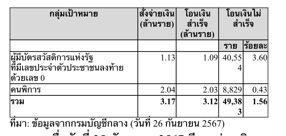 สำหรับการโอนเงินเมื่อวันที่ 25 กันยายน 2567 ให้กลุ่มเป้าหมาย 3.17 ล้านราย โอนเงินไม่สำเร็จ 49,383 ราย คิดเป็นร้อยละ 1.56 สาเหตุการโอนเงินไม่สำเร็จ ดังนี้