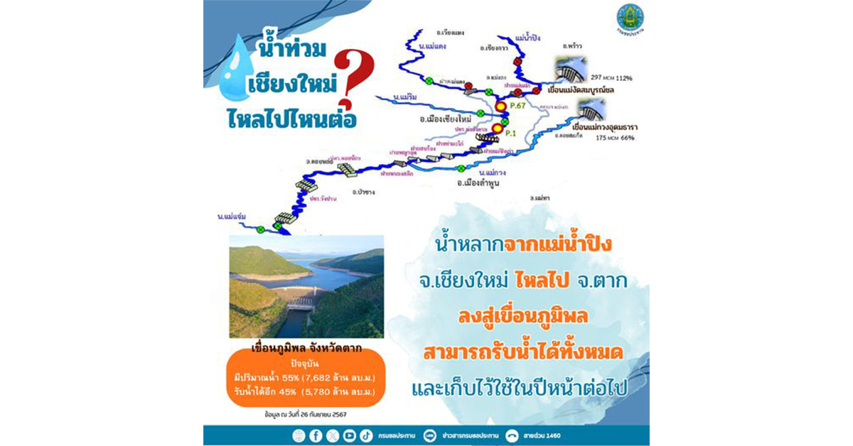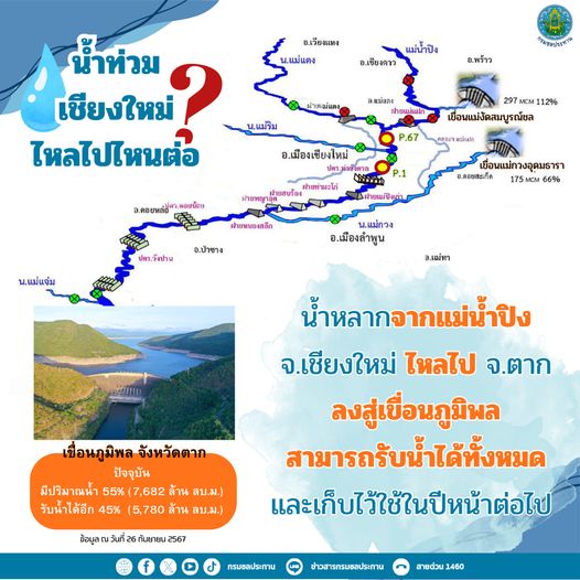 กรมชลประทานยังอธิบายด้วยว่า จากสถานการณ์น้ำท่วมเชียงใหม่ หลายคนสงสัยว่า ปริมาณน้ำจะไหลลงไปที่ไหนต่อ โดยแม่น้ำปิงจะไหลไปที่จังหวัดตาก ลงสู่เขื่อนภูมิพล ซึ่งสามารถรับน้ำได้ทั้งหมด และยังสามารถเก็บไว้ใช้ในปีหน้าต่อไปได้ด้วย -511 สำนักข่าวไทย