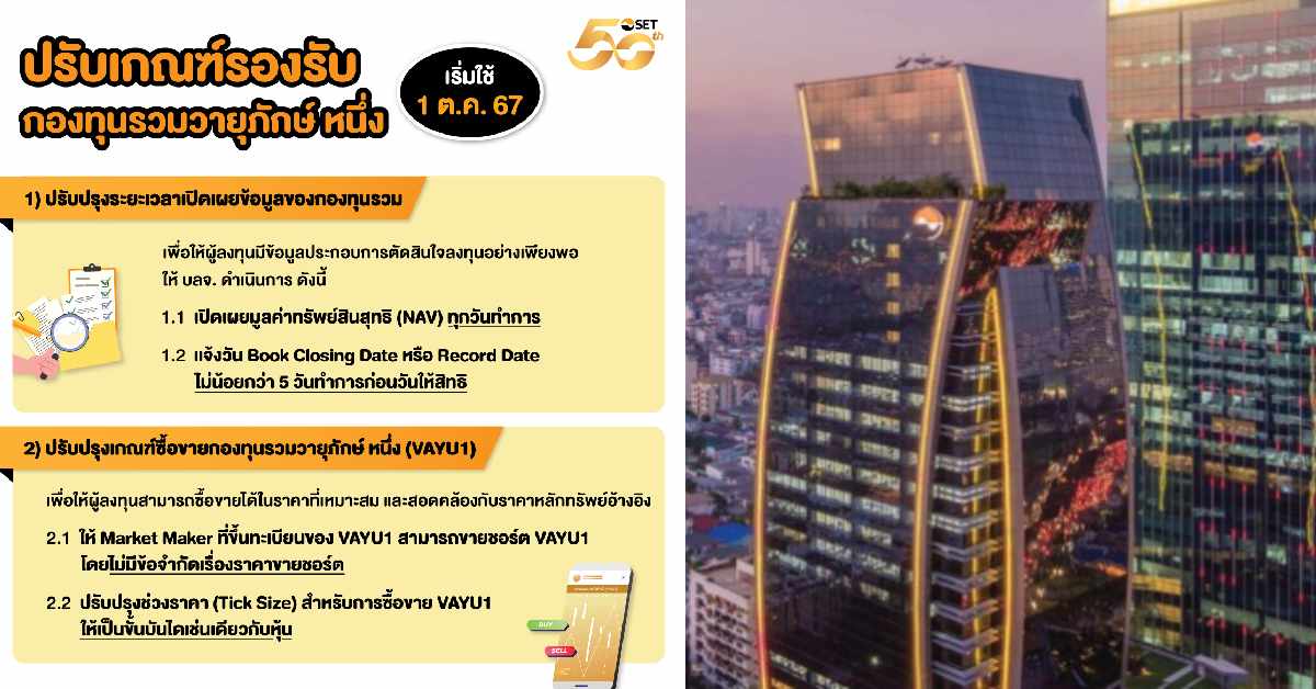 ตลาดหลักทรัพย์แห่งประเทศไทย (ตลท.) ปรับปรุงเกณฑ์รองรับการซื้อขายหน่วยลงทุนของกองทุนรวม และกองทุนรวมวายุภักษ์ หนึ่ง (VAYU1) ให้มีความเหมาะสม และเป็นประโยชน์แก่ผู้ลงทุน โดยปรับปรุงระยะเวลาการเปิดเผย NAV และวัน Book Closing Date / Record Date พร้อมทั้งปรับปรุงเกณฑ์ราคาขายชอร์ตให้แก่ Market Maker ของ VAYU1 และช่วงราคา (Tick Size) ในการซื้อขาย VAYU1 มีผลใช้บังคับตั้งแต่วันที่ 1 ตุลาคม 2567 เป็นต้นไป โดยมีสาระสำคัญ ดังนี้