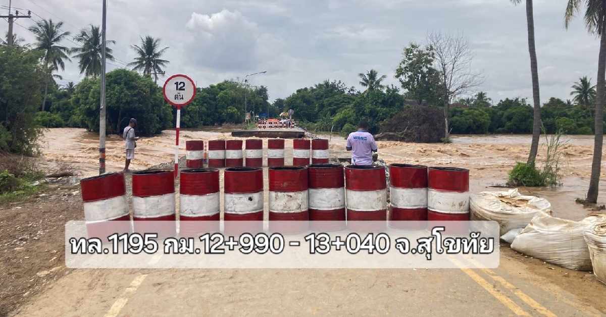 สามารถใช้เส้นทางเลี่ยง ทล.1195 กม. 9+350 แยกเกาะวงษ์เกียรติ์ และบริเวณ ทล.1195 - ทางหลวงหมายเลข 1195 อ.สวรรคโลก สายเตว็ดใน – วังไม้ขอน กม.ที่ 25+500 – 27+700 ระดับน้ำ 30 ซม. การจราจรผ่านไม่ได้