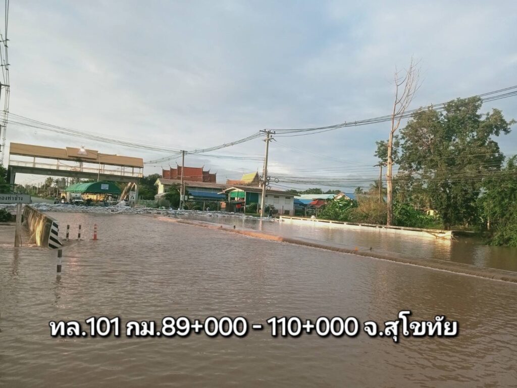 จังหวัดสุโขทัย การจราจรผ่านไม่ได้ 3 แห่ง - ทางหลวงหมายเลข 101 อ.ศรีสำโรง สายคลองโพธิ์ – ท่าช้าง กม.ที่ 89+000 – 110+000 ระดับน้ำ 35 ซม. สามารถใช้เส้นทางเลี่ยง