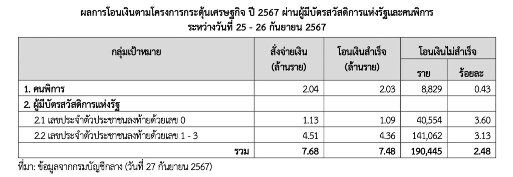 นายพรชัย ฐีระเวช โฆษกกระทรวงการคลัง เปิดเผยว่า การโอนเงินตามโครงการกระตุ้นเศรษฐกิจ ปี 2567 ผ่านผู้มีบัตรสวัสดิการฯ และคนพิการ ตั้งแต่วันที่ 25 กันยายน 2567 เป็นต้นมา การโอนเงินเมื่อวันที่ 26 กันยายน 2567 ให้ผู้มีบัตรสวัสดิการฯ เลขประจำตัวประชาชนลงท้ายด้วยเลข 1 – 3 จำนวน 4.51 ล้านราย พบว่า มีการโอนเงินไม่สำเร็จ 141,062 ราย ทำให้มียอดสะสมของการโอนเงินให้แก่กลุ่มเป้าหมายสำเร็จแล้วรวมทั้งสิ้น 7.48 ล้านราย และการโอนเงินไม่สำเร็จจำนวน 190,445 ราย