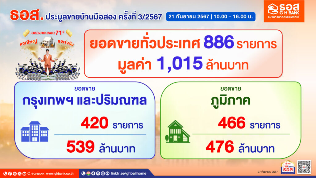 กรุงเทพฯ 27 ก.ย. – ธอส.ประมูลขายบ้านมือสอง ครั้งที่ 3/67 โกยรายได้กว่าพันล้านบาท จากบ้าน 886 รายการ ยอมรับประชาชนยังต้องการซื้อบ้าน