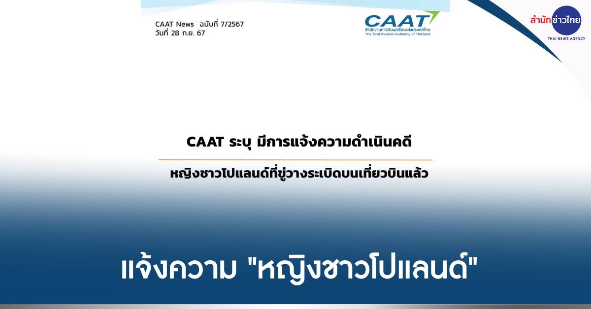 กรุงเทพฯ 28 ก.ย.-CAAT ระบุมีการแจ้งความดำเนินคดีหญิงชาวโปแลนด์ที่ขู่วางระเบิดบนเที่ยวบินไทยเวียตเจ็ทแล้ว