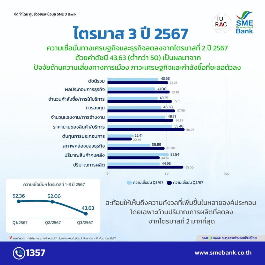 นายพิชิต มิทราวงศ์ กรรมการผู้จัดการ ธนาคารพัฒนาวิสาหกิจขนาดกลางและขนาดย่อมแห่งประเทศไทย (ธพว.) หรือ SME D Bank กล่าวว่า SME D Bank โดย “ศูนย์วิจัยและข้อมูล ธพว.” ร่วมกับ “สถาบันวิจัยและให้คำปรึกษาแห่งมหาวิทยาลัยธรรมศาสตร์” พบว่าภาพรวมดัชนีเชื่อมั่นฯ ไตรมาสที่ 3/2567 อยู่ที่ระดับ 43.63 ปรับตัวลดลงจากไตรมาสที่ 2/2567 ที่ผ่านมา ที่อยู่ในระดับ 52.06