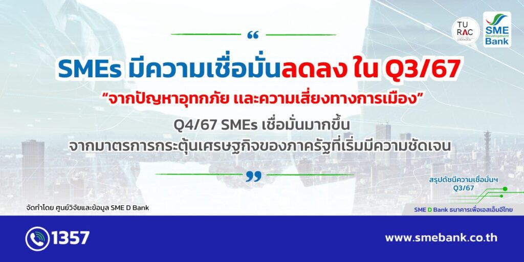 ผลสำรวจดัชนีเชื่อมั่นเอสเอ็มอี ไตรมาส 3/67 จากการสำรวจของ SME D Bank ร่วมกับ ม.ธรรมศาสตร์ ชี้ภาพรวมปรับลดลงจากปัจจัยหลายด้านรุมเร้า เช่น อุทกภัย ความเสี่ยงทางการเมือง กำลังซื้อชะลอตัว ส่วนคาดการณ์ 3 เดือนข้างหน้า หรือ Q4/67 เชื่อมั่นฟื้นจากมาตรการกระตุ้นเศรษฐกิจภาครัฐ ด้าน SME D Bank ประกาศช่วยเสริมแกร่งเอสเอ็มอี ดันมาตรการพักหนี้เงินต้นและดอกเบี้ยลดภาระค่าใช้จ่าย คู่เติมทุนสินเชื่ออัตราดอกเบี้ยพิเศษ ไม่ต้องใช้หลักทรัพย์ค้ำประกัน ช่วยเตรียมพร้อม เดินหน้าธุรกิจเต็มศักยภาพ