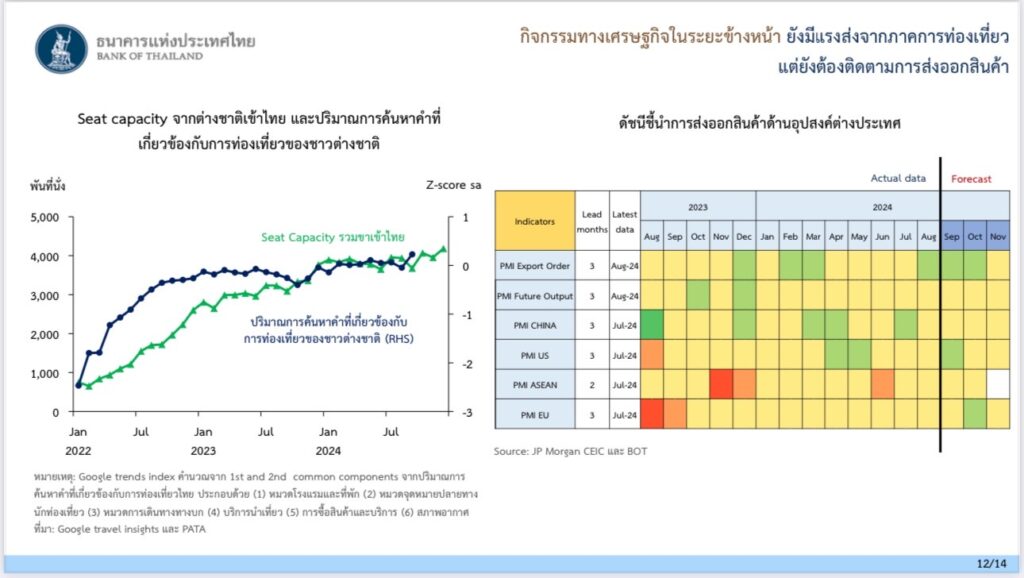 สำหรับภาวะเศรษฐกิจและการเงินเดือนสิงหาคม 2567 เศรษฐกิจไทยโดยรวมทรงตัวจากเดือนก่อน การบริโภคภาคเอกชนปรับเพิ่มขึ้นเล็กน้อยจากหมวดสินค้าไม่คงทน ขณะที่ดัชนีความเชื่อมั่นผู้บริโภคลดลงต่อเนื่องจากความกังวลด้านค่าครองชีพที่อยู่ในระดับสูง เศรษฐกิจไทยที่ขยายตัวต่ำรวมถึงสถานการณ์น้ำท่วม