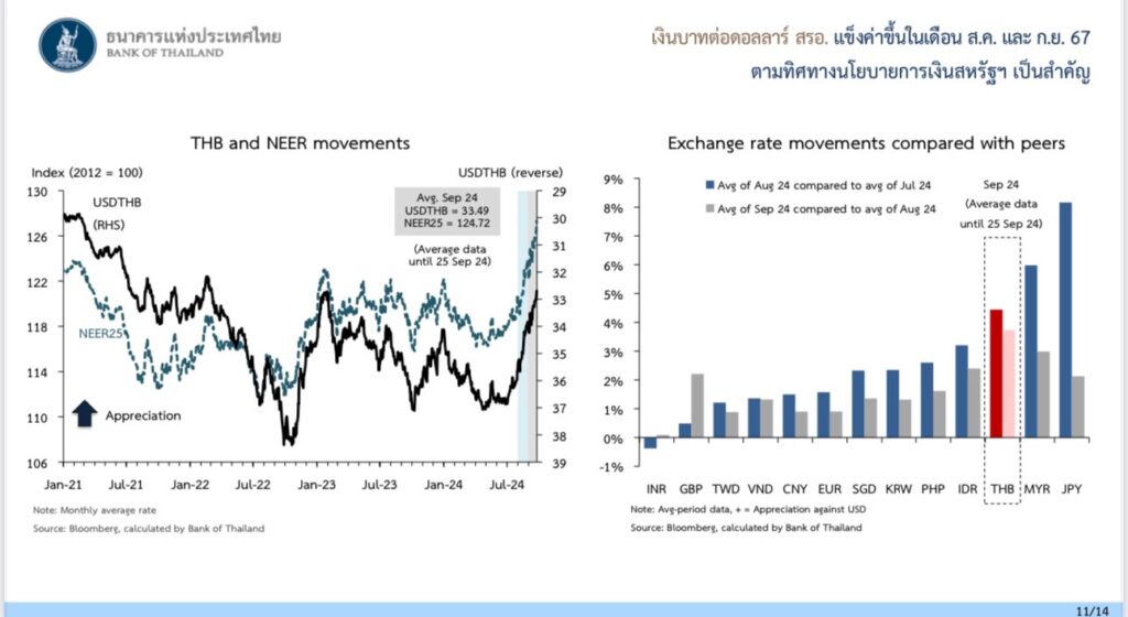นางสาวชญาวดี ชัยอนันต์ ผู้ช่วยผู้ว่าการสายองค์กรสัมพันธ์ และโฆษกธนาคารแห่งประเทศไทย (ธปท.) กล่าวถึงเงินบาทที่แข็งค่าขึ้นเร็ว มาจากหลายปัจจัย ทั้งการอ่อนค่าของเงินดอลลาร์สหรัฐ หลังธนาคารกลางสหรัฐ (เฟด) ปรับลดดอกเบี้ย 0.50% มากกว่าที่คาดการณ์ ทำให้มองว่าเศรษฐกิจสหรัฐจะชะลอตัว บวกกับเงินเยนญี่ปุ่นแข็งค่า และเงินหยวนของจีนแข็งค่า ส่งผลให้ค่าเงินบาทแข็งค่าขึ้นตามเงินสกุลภูมิภาค แต่ยังมีเงินริงกิต ของมาเลเซีย ที่แข็งค่ามากที่สุดประมาณ 11% ส่วนเงินบาทไทยแข็งค่าในลำดับที่ 2-3 นอกจากนี้ ประเทศไทยยังมีปัจจัยเฉพาะจากรัฐบาลมีเสถียรภาพมากขึ้น การเริ่มดำเนินนโยบายกระตุ้นเศรษฐกิจ ภาพรวมการลงทุนในตลาดหุ้นดีขึ้น และราคาทองคำก็ปรับตัวสูงขึ้น ซึ่ง ธปท.เข้าดูแลในช่วงที่เงินบาทผันผวนแรง เพื่อลดผลกระทบ ทำให้ทุนสำรองระหว่างประเทศปรับเพิ่มขึ้น