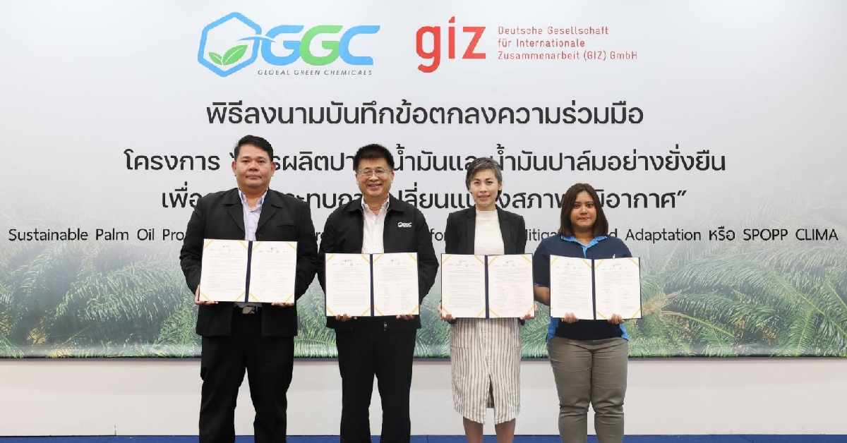 ผู้บริหาร และผู้แทนจาก GGC GIZ หน่วยงานภาครัฐ และพันธมิตรใน 4 จังหวัดผู้ผลิตปาล์มน้ำมันภาคใต้ ได้แก่ ตรัง กระบี่ พังงา และชุมพร ร่วมลงนามบันทึกข้อตกลงความร่วมมือ โครงการการผลิตปาล์มน้ำมันและน้ำมันปาล์มอย่างยั่งยืน เพื่อลดผลกระทบการเปลี่ยนแปลงสภาพภูมิอากาศ (Sustainable Palm Oil Production and Procurement Project for Climate Mitigation and Adaptation หรือ SPOPP CLIMA) ซึ่งเป็นโครงการต่อยอดความสำเร็จจากการรับรองกลุ่มเกษตรกรรายย่อย ตามมาตรฐานการปลูกปาล์มอย่างยั่งยืน (Roundtable Sustainable Palm Oil หรือ RSPO) ภายใต้โครงการการผลิตปาล์มน้ำมันและน้ำมันปาล์มอย่างยั่งยืน หรือ SPOPP ที่ได้รับทุนสนับสนุนจากบริษัท โกลบอลกรีนเคมิคอล จำกัด (มหาชน) หรือ GGC ดำเนินการโดยองค์กรความร่วมมือระหว่างประเทศของเยอรมัน หรือ GIZ และความร่วมมือจากกรมวิชาการเกษตร โดยมุ่งเน้นในการสร้างองค์ความรู้ให้กับเกษตรกรรายย่อยที่ผ่านการรับรองมาตรฐาน RSPO ในโครงการ SPOPP ให้สามารถนำข้อมูลที่มีอยู่มาต่อยอดในการคำนวณคาร์บอนฟุตปริ้นท์สำหรับผลิตภัณฑ์ปาล์มน้ำมันทะลายสด และมีแนวทางการจัดการสวนแบบคาร์บอนต่ำ ซึ่งการลดคาร์บอนฟุตปริ้นท์ไม่เพียงแต่ช่วยลดผลกระทบต่อสิ่งแวดล้อมและสภาพภูมิอากาศ แต่ยังเป็นการเพิ่มความยั่งยืนให้กับอุตสาหกรรมปาล์มน้ำมัน และสร้างภาพลักษณ์ที่ดีให้กับผลิตภัณฑ์ปาล์มน้ำมันของไทยในตลาดโลกอีกด้วย