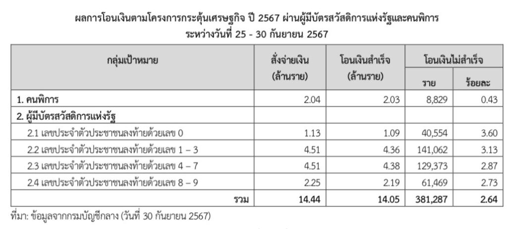 นายพรชัย ฐีระเวช ผู้อำนวยการสำนักงานเศรษฐกิจการคลัง ในฐานะโฆษกกระทรวงการคลัง เปิดเผยว่า ผลการโอนเงินตามโครงการกระตุ้นเศรษฐกิจ ปี 2567 ผ่านผู้มีบัตรสวัสดิการแห่งรัฐและคนพิการ ตั้งแต่วันที่ 25-30 ก.ย.67 สำหรับการโอนเงิน ในวันที่ 30 กันยายน 2567 ให้ผู้มีบัตรสวัสดิการฯ เลขประจำตัวประชาชนลงท้ายด้วยเลข 8-9 จำนวน 2.25 ล้านราย โอนเงินไม่สำเร็จ 61,469 ราย มียอดสะสมของการโอนเงินให้แก่กลุ่มเป้าหมายสำเร็จ รวมทั้งสิ้น 14.05 ล้านราย ขณะที่ยอดการโอนเงินไม่สำเร็จ 381,287 ราย
