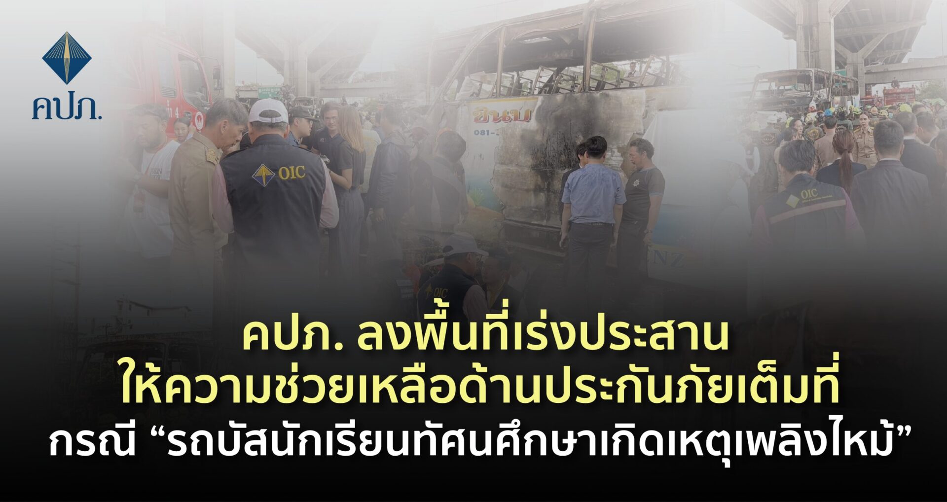 กรุงเทพฯ 1 ต.ค. – คปภ. ลงพื้นที่เร่งประสานให้ความช่วยเหลือด้านประกันภัยเต็มที่ กรณีรถบัสนักเรียนทัศนศึกษาเกิดเหตุเพลิงไหม้