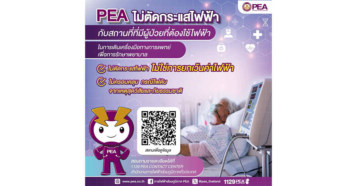 ทั้งนี้ PEA มีหลักเกณฑ์ยกเว้นการงดจ่ายไฟฟ้า (ไม่ตัดกระแสไฟฟ้า) กับสถานที่หรือบ้านที่มีผู้ป่วยที่ต้องใช้ไฟฟ้าในการเดินเครื่องมือทางการแพทย์เพื่อการรักษาพยาบาล โดยผู้ใช้ไฟฟ้าติดต่อลงทะเบียนที่สำนักงาน PEA ในพื้นที่ หรือสอบถามข้อมูลได้ที่ 1129 PEA Contact Center ตลอด 24 ชั่วโมง -511. สำนักข่าวไทย