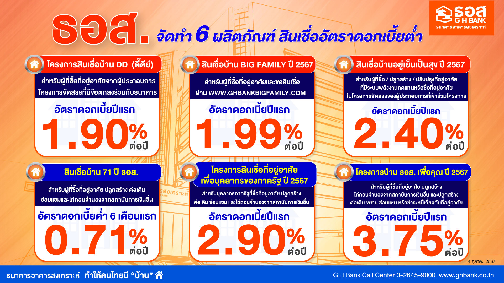 3) สินเชื่อบ้านอยู่เย็น เป็นสุข ปี 2567 อัตราดอกเบี้ยปีแรก 2.40% ต่อปี เฉลี่ย 3 ปีแรก เท่ากับ 3.10% กู้ 1 ล้านบาท ผ่อนชำระเงินงวดเริ่มต้นเพียง 2,800 บาทต่อเดือน 4) สินเชื่อบ้าน 71 ปี ธอส. อัตราดอกเบี้ยต่ำ 6 เดือนแรก เพียง 0.71% ต่อปี เดือนที่ 7 – 24 เท่ากับ 2.71% ต่อปี เฉลี่ย 3 ปีแรก เท่ากับ 2.71% กู้ 1 ล้านบาท ผ่อนชำระเงินงวดเริ่มต้นเพียง 2,400 บาทต่อเดือน 5) โครงการสินเชื่อที่อยู่อาศัยเพื่อบุคลากรภาครัฐ ปี 2567 อัตราดอกเบี้ยปีที่ 1 เท่ากับ 2.90% ต่อปี เฉลี่ย 3 ปีแรก เท่ากับ 3.51% กู้ 1 ล้านบาท ผ่อนชำระเงินงวดเริ่มต้นเพียง 3,600 บาทต่อเดือน และ 6) โครงการบ้าน ธอส. เพื่อคุณ ปี 2567 อัตราดอกเบี้ยปีที่ 1 เท่ากับ 3.75% ต่อปี เฉลี่ย 3 ปีแรก เท่ากับ 4.31% กู้ 1 ล้านบาท ผ่อนชำระเงินงวดเริ่มต้นเพียง 4,600 บาทต่อเดือน