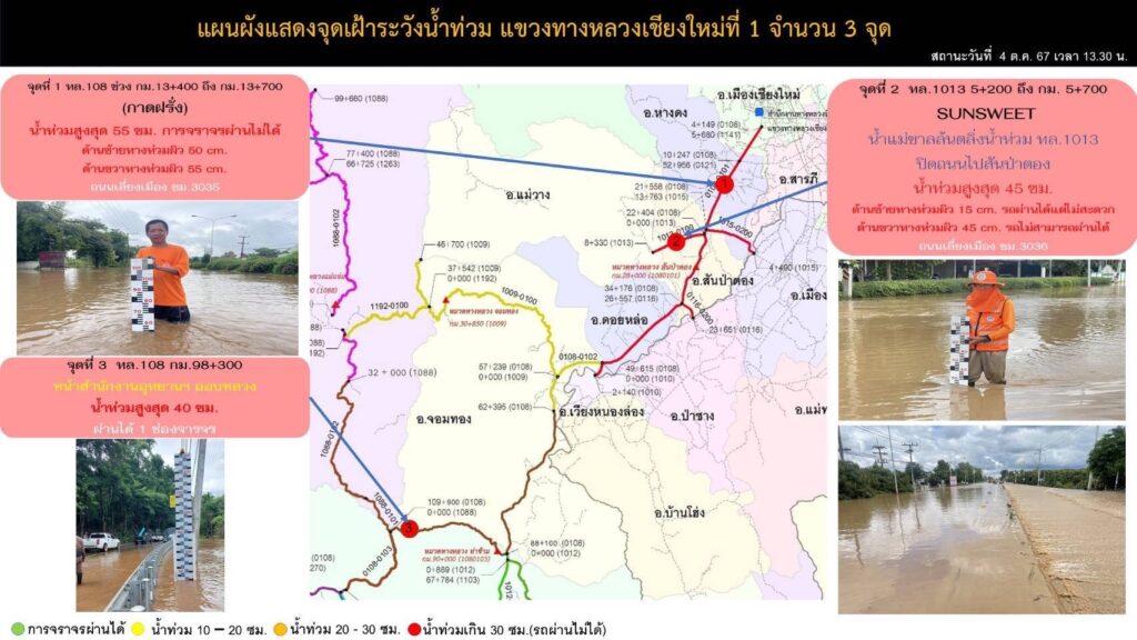 ขณะที่ ทช. ได้รายงานสถานการณ์ล่าสุดว่าจากน้ำท่วมรอบใหม่ บนถนนสาย ชม. 3029 ถนนสมโภช 700 ปี (ถนนวงแหวนรอบกลาง) ได้ส่งเจ้าพนักงานเข้าลงพื้นที่ลาดตระเวนเฝ้าระวังน้ำท่วมทันที พบว่า มีน้ำท่วมขังบนผิวจราจรทั้ง 3 เลน ทั้งสองฝั่ง ด้านช้ายทางและขวา ทางช่องจราจรด้านชิดกับเกาะกลาง น้ำท่วมสูงขึ้นประมาณ 25 ซม ระดับน้ำทรงตัว เริ่มตั้งแต่ ช่วง กม. ที่ 19+800 – 20 + 300 รถยนต์ไม่สามารถเคลื่อนผ่านได้ แขวงทางหลวงชนบทจึงปิดการจราจรทั้ง 2 ฝั่ง โดยขณะนี้แขวงฯ ได้ติดตั้งป้ายเตือน น้ำท่วม พร้อมทั้งให้เจ้าหน้าที่คอยดูแลประชาชนตลอดเส้นทาง