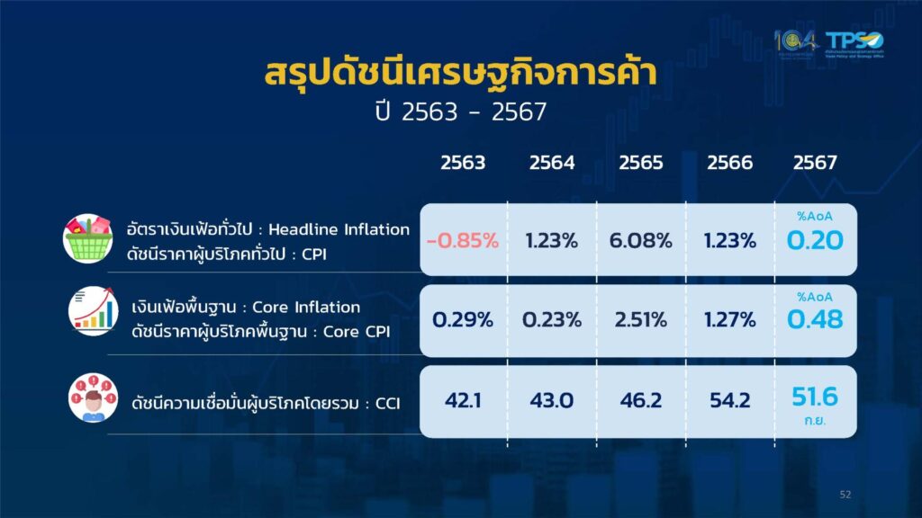 ทั้งนี้ สนค.ได้ปรับลดเป้าหมายอัตราเงินเฟ้อของปีนี้ใหม่ มาอยู่ที่ 0.2-0.8% จากเป้าเดิมที่ 0-1% แต่ค่ากลางยังคงอยู่เท่าเดิมที่ 0.5% เป็นผลจากราคาน้ำมันดิบในตลาดโลกช่วงครึ่งปีแรกอยู่ในระดับต่ำกว่าที่ประเมินไว้ ประกอบกับสถานการณ์ด้านอัตราแลกเปลี่ยนที่เงินบาทแข็งค่ามากกว่าคาด โดยสมมติฐานล่าสุดของเป้าหมายเงินเฟ้อใหม่ในปี 67 นี้ มาจากอัตราการเติบโตทางเศรษฐกิจ (GDP) ปีนี้ที่ 2.3-2.8% น้ำมันดิบดูไบ เฉลี่ยทั้งปี 75-85 ดอลลาร์/บาร์เรล และอัตราแลกเปลี่ยน เฉลี่ยทั้งปี 34.50-35.50 บาท/ดอลลาร์ อัตราเงินเฟ้อทั่วไปของไทยเมื่อเทียบกับต่างประเทศ ข้อมูลล่าสุดเดือนสิงหาคม 2567 พบว่า อัตราเงินเฟ้อทั่วไปของไทยสูงขึ้นร้อยละ 0.35 ซึ่งยังคงอยู่ในกลุ่มประเทศที่มีอัตราเงินเฟ้อต่ำ โดยอยู่ระดับต่ำอันดับ 5 จาก 130 เขตเศรษฐกิจที่ประกาศตัวเลข และต่ำเป็นอันดับ 2 ในอาเซียนจาก 8 ประเทศที่ประกาศตัวเลข (บรูไน มาเลเซีย อินโดนีเซีย สิงคโปร์ ฟิลิปปินส์ เวียดนาม สปป.ลาว) ดัชนีราคาผู้บริโภคทั่วไป ไตรมาสที่ 3 ปี 2567 เมื่อเทียบกับไตรมาสเดียวกันของปี 2566 สูงขึ้นร้อยละ 0.60 (YoY) และเมื่อเทียบกับไตรมาสก่อนหน้า สูงขึ้นร้อยละ 0.21 (QoQ) ส่วนดัชนีราคาผู้บริโภคทั่วไป เฉลี่ย 9 เดือน (มกราคม – กันยายน) ของปี 2567 เมื่อเทียบกับช่วงเดียวกันของปี 2566 สูงขึ้นร้อยละ 0.20 (AoA)