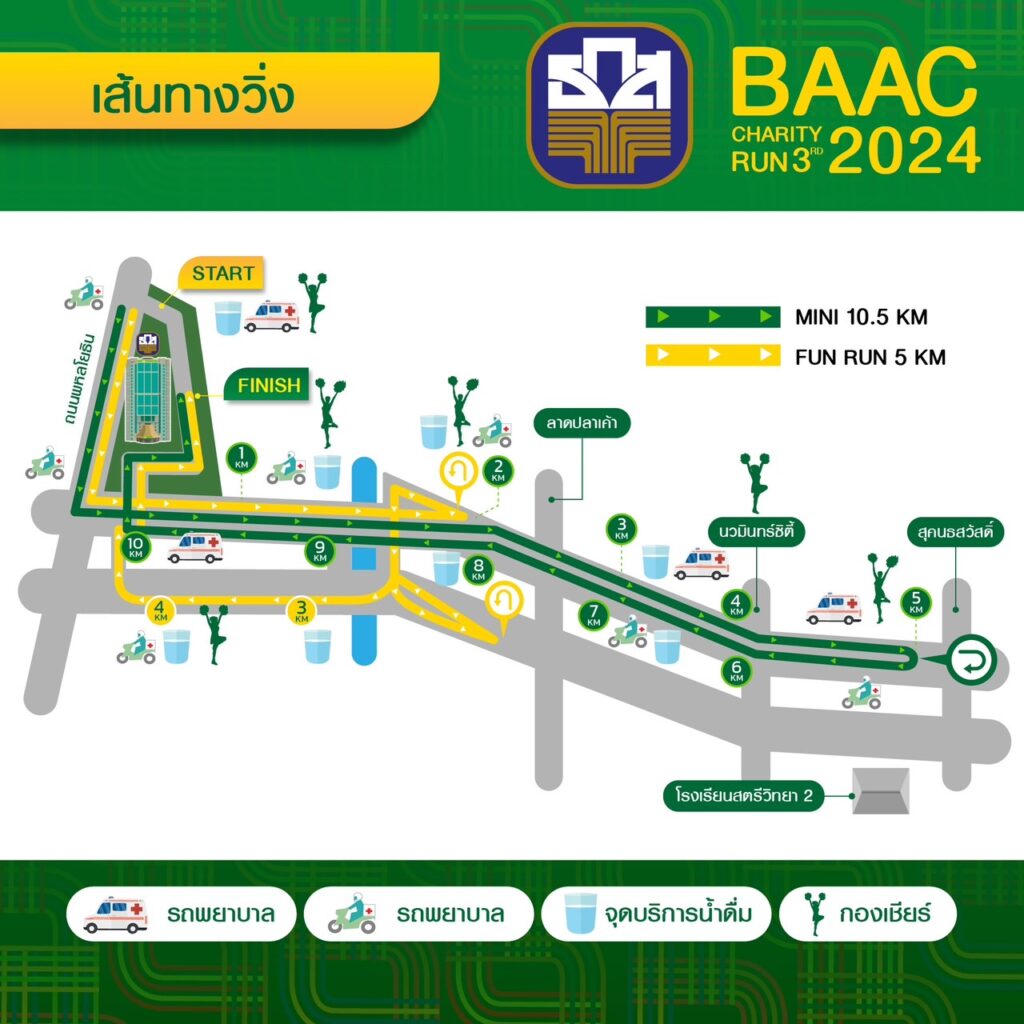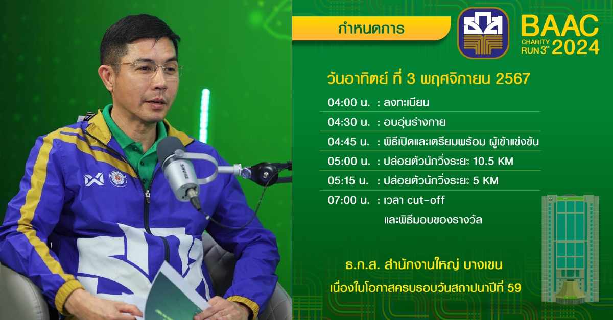 ธ.ก.ส.ครบรอบวันสถาปนาปีที่ 59 จัดงานวิ่งครั้งยิ่งใหญ่ “BAAC Charity Run 3rd 2024” เปิดรับสมัครทั้งระยะ Fun Run 5 กม. และ Mini Marathon 10.5 กม. ชิงรางวัลรวมมูลค่ากว่า 1 ล้านบาท เตรียมปล่อยตัวออกวิ่งพร้อมกันในวันที่ 3 พ.ย.2567 ณ ธ.ก.ส. สำนักงานใหญ่ กรุงเทพฯ เปิดรับสมัครแล้ววันนี้ผ่าน https://race.thai.run/baacrun2024