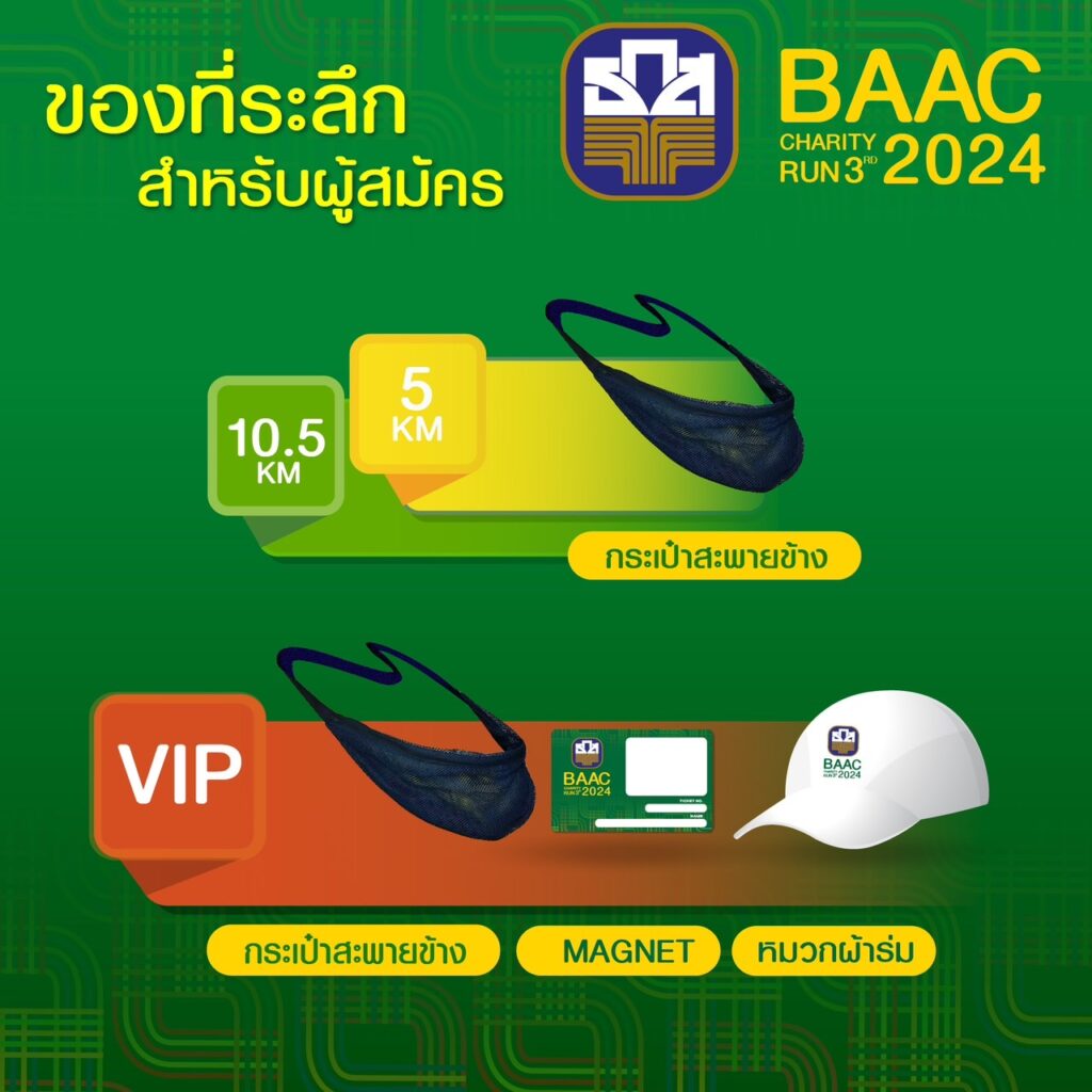 นายฉัตรชัย ศิริไล ผู้จัดการธนาคารเพื่อการเกษตรและสหกรณ์การเกษตร (ธ.ก.ส.) เปิดเผยว่า ธ.ก.ส. จัดงานวิ่งครั้งใหญ่แห่งปี BAAC Charity Run 3rd 2024 ฉลองเนื่องในโอกาสวันสถาปนาธนาคารปีที่ 59 ในวันอาทิตย์ที่ 3 พฤศจิกายน 2567 ณ ธ.ก.ส. สำนักงานใหญ่ บางเขน กรุงเทพฯ โดยเปิดรับสมัครการวิ่งเป็น 2 ระยะ ได้แก่ ระยะ Fun Run 5 กิโลเมตร และระยะ Mini Marathon 10.5 กิโลเมตร ค่าสมัคร 600 บาท และ VIP ค่าสมัคร 1,000 บาท พร้อมรับของที่ระลึกจาก ธ.ก.ส. อาทิ เสื้อวิ่ง BIB กระเป๋าสะพายข้าง Magnet และหมวกผ้าร่ม