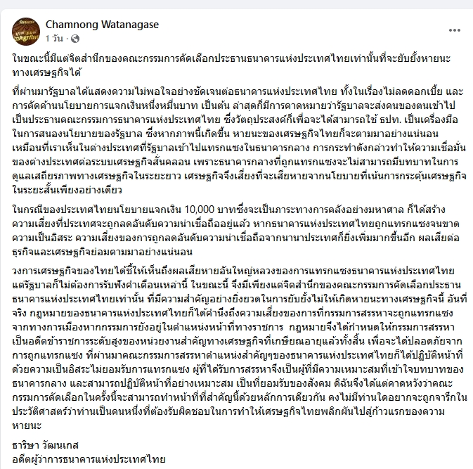 นางธาริษา วัฒนเกส อดีตผู้ว่าการธนาคารแห่งประเทศไทย โพสต์ในเฟซบุ๊ก ระบุในขณะนี้มีแต่จิตสำนึกของคณะกรรมการคัดเลือกประธาน ธปท.เท่านั้นที่จะยับยั้งหายนะทางเศรษฐกิจได้ โดยที่ผ่านมารัฐบาลได้แสดงความไม่พอใจอย่างชัดเจนต่อ ธปท.ทั้งในเรื่องไม่ลดดอกเบี้ย และการคัดค้านนโยบายการแจกเงินหนึ่งหมื่นบาท เป็นต้น ล่าสุดก็มีการคาดหมายว่ารัฐบาลจะส่งคนของตนเข้าไปเป็นประธาน ธปท. เพื่อเป็นเครื่องมือในการสนองนโยบายของรัฐบาล ซึ่งหากภาพนี้เกิดขึ้น หายนะของเศรษฐกิจไทยก็จะตามมาอย่างแน่นอน เหมือนในต่างประเทศที่รัฐบาลเข้าไปแทรกแซงในธนาคารกลาง การกระทำดังกล่าวทำให้ความเชื่อมั่นของต่างประเทศต่อระบบเศรษฐกิจสั่นคลอน เพราะธนาคารกลางที่ถูกแทรกแซงจะไม่สามารถมีบทบาทในการดูแลเสถียรภาพทางเศรษฐกิจในระยะยาว เศรษฐกิจจึงเสี่ยงที่จะเสียหายจากนโยบายที่เน้นการกระตุ้นเศรษฐกิจในระยะสั้นเพียงอย่างเดียว