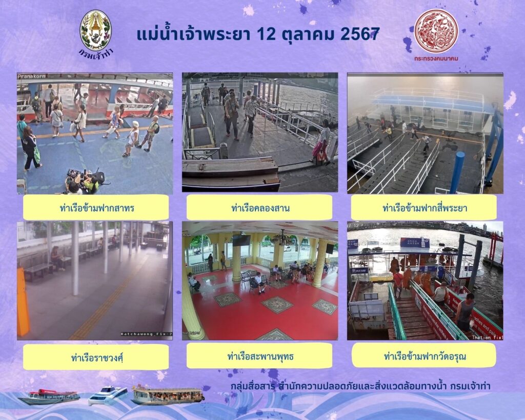 กรมเจ้าท่า ดูแลความปลอดภัยและอำนวยความสะดวกให้กับพี่น้องประชาชนในการเดินทางทางน้ำทั่วประเทศ รับวันหยุด 12-14 ตุลาคม 2567 ที่คาดว่าประชาชนจะออกเดินทางท่องเที่ยวในช่วงวันหยุด โดย ศูนย์ปลอดภัยทางน้ำกรมเจ้าท่า ได้ตรวจสอบ พร้อมสรุปรายงานสถานการณ์ทางน้ำ ประจำวันที่ 11 ตุลาคม 2567 ส่วนกลาง เรือด่วนเจ้าพระยา ให้บริการ 106 เที่ยว ผู้โดยสาร 10,675 คน เรือทัวร์ริสท์โบ๊ท ให้บริการ 30 เที่ยว ผู้โดยสาร 3,077 คน เรือไฟฟ้าเจ้าพระยา ให้บริการ 35 เที่ยว ผู้โดยสาร 1,586 คน เรือโดยสารข้ามฟาก ให้บริการ 927 เที่ยว ผู้โดยสาร 24,793 คน เรือภัตตาคาร ให้บริการ 38 เที่ยว ผู้โดยสาร 6,525 คน คลองแสนแสบ เรือโดยสารคลองแสนแสบ ให้บริการ 177 เที่ยว ผู้โดยสาร 23,033 คน และในส่วนภูมิภาค เรือโดยสาร ให้บริการ 2,894 เที่ยว ผู้โดยสาร 139,960 คน