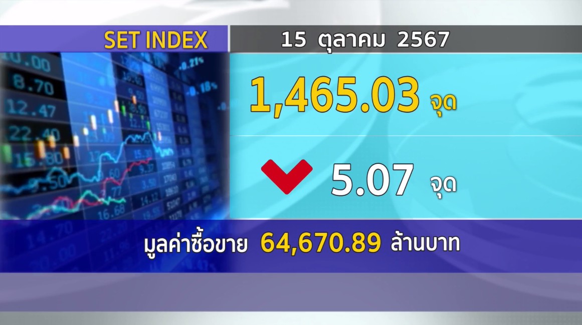 กรุงเทพฯ 15 ต.ค. – SET ปิดวันนี้ที่ 1,465.03 จุด ลดลง 5.07 จุด (-0.34%) มูลค่าซื้อขาย 64,715.76 ล้านบาท