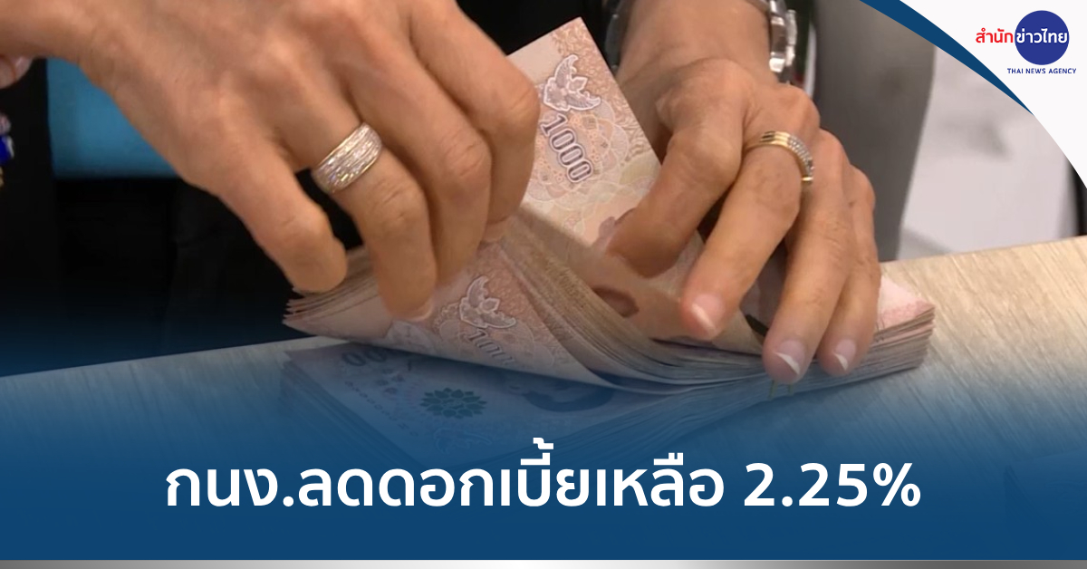 กรุงเทพฯ 16 ต.ค. – กนง. มีมติลดอัตราดอกเบี้ยนโยบายร้อยละ 0.25 ต่อปี จากร้อยละ 2.50 เป็นร้อยละ 2.25 ต่อปี โดยให้มีผลทันที เพื่อช่วยบรรเทาภาระหนี้