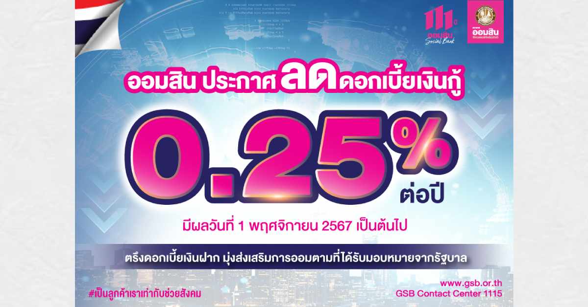 กรุงเทพฯ 18 ต.ค. – “ออมสิน” ลดดอกเบี้ยเงินกู้ 0.25% มีผล 1 พ.ย.67 ประกาศตรึงดอกเบี้ยเงินฝาก ตามภารกิจส่งเสริมการออมเพื่อสังคม