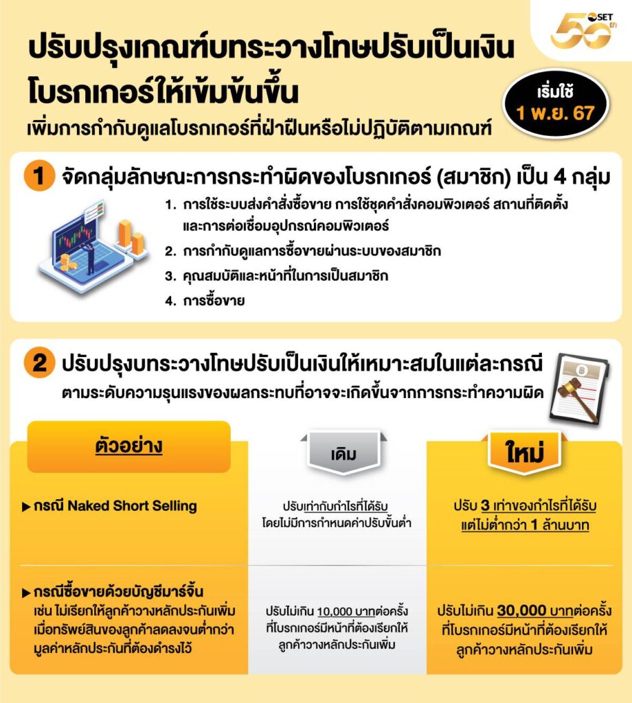 ตลาดหลักทรัพย์ฯ เพิ่มความเข้มข้นในการกำกับดูแลบริษัทหลักทรัพย์ซึ่งเป็นสมาชิกตลาดหลักทรัพย์ฯ (โบรกเกอร์) ให้มีประสิทธิภาพมากยิ่งขึ้น โดยปรับปรุงเกณฑ์บทระวางโทษปรับเป็นเงินสำหรับโบรกเกอร์ให้สูงขึ้น ซึ่งเป็นหนึ่งในมาตรการยกระดับการกำกับดูแล เพื่อเพิ่มการกำกับดูแลสมาชิกที่ฝ่าฝืนหรือไม่ปฏิบัติตามกฎเกณฑ์ โดยจะมีผลใช้บังคับตั้งแต่วันที่ 1 พฤศจิกายน 2567 เป็นต้นไป